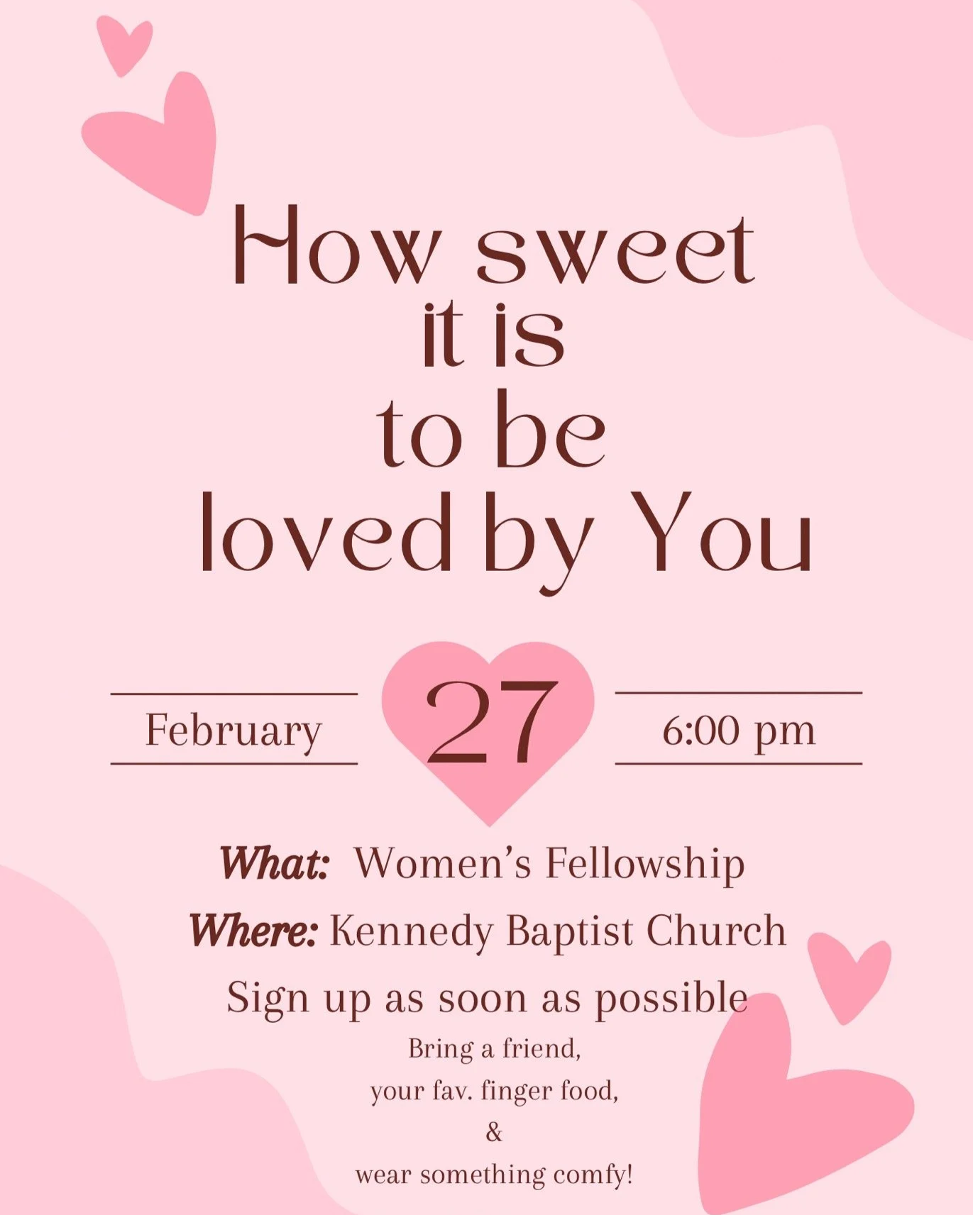 Come and join your sisters in Christ at KBC for a fun evening of fellowship! This event is open to all women and will include finger foods, fun and games, and plenty of time for fellowship. Sign up today!